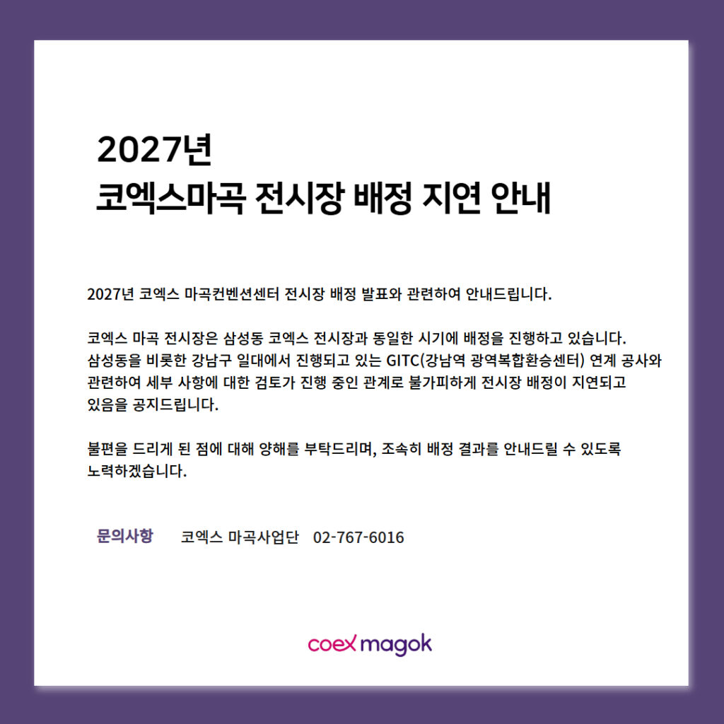 2027년 코엑스마곡 전시장 배정 지연 안내